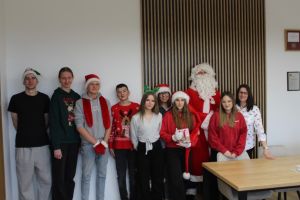 5 grudnia naszą szkołę opanował wyjątkowy gość – Mikołaj! Uzbrojony w wielki worek cukierków i ekipę z Samorządu Uczniowskiego wędrował po korytarzach, zadając pytania jak z rodzinnego quizu świątecznego. Każdy, kto odpowiedział poprawnie, otrzymywał słodką nagrodę. A jeśli ktoś nie znał odpowiedzi? Spokojnie – cukierek i tak się należał… choć pod czujnym spojrzeniem Mikołaja! Nie zapomniał też o nauczycielach i pracownikach szkoły – oni również zdali test grzeczności na 6+ (podobno!). Wszędzie słychać było śmiech, rozmowy i świąteczne melodie. Niektórzy uczniowie próbowali sprytnie podpowiadać sobie odpowiedzi, ale Mikołaj miał oko na każdą próbę „oszustwa”!